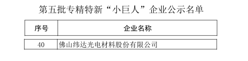 近日,佛塑科技控股子公司佛山緯達光電材料股份有限公司(以下簡稱“緯達光電”)成功入選第五批國家專精特新“小巨人”企業,標志著緯達光電在科技創新能力、核心技術優勢、發展潛力等方面獲得國家級認可,同時也標志著緯達光電繼北交所上市后,發展再迎來新的里程碑。